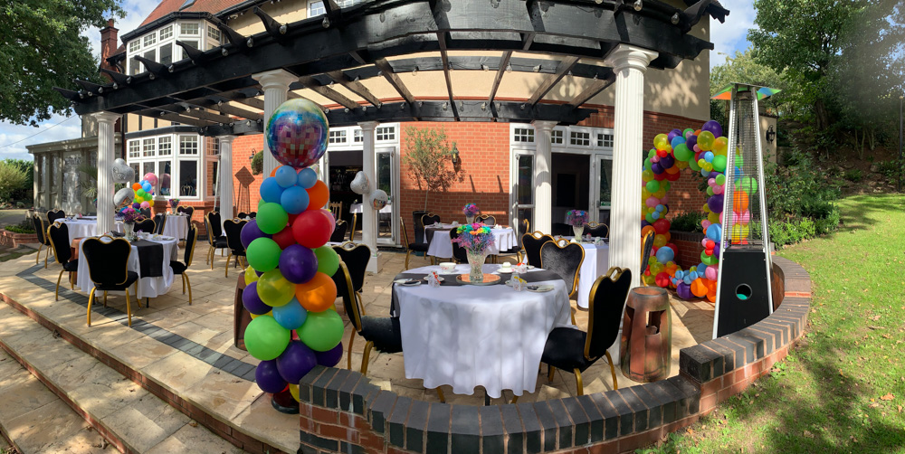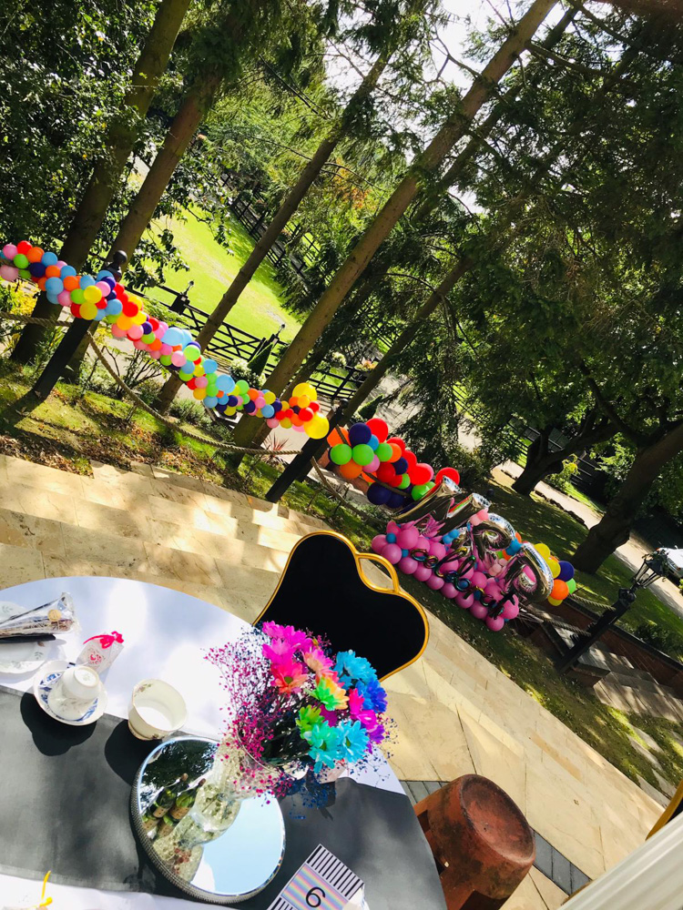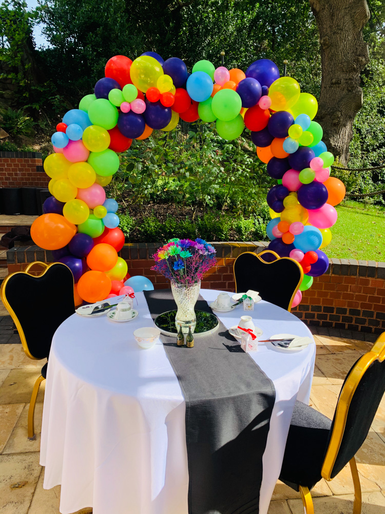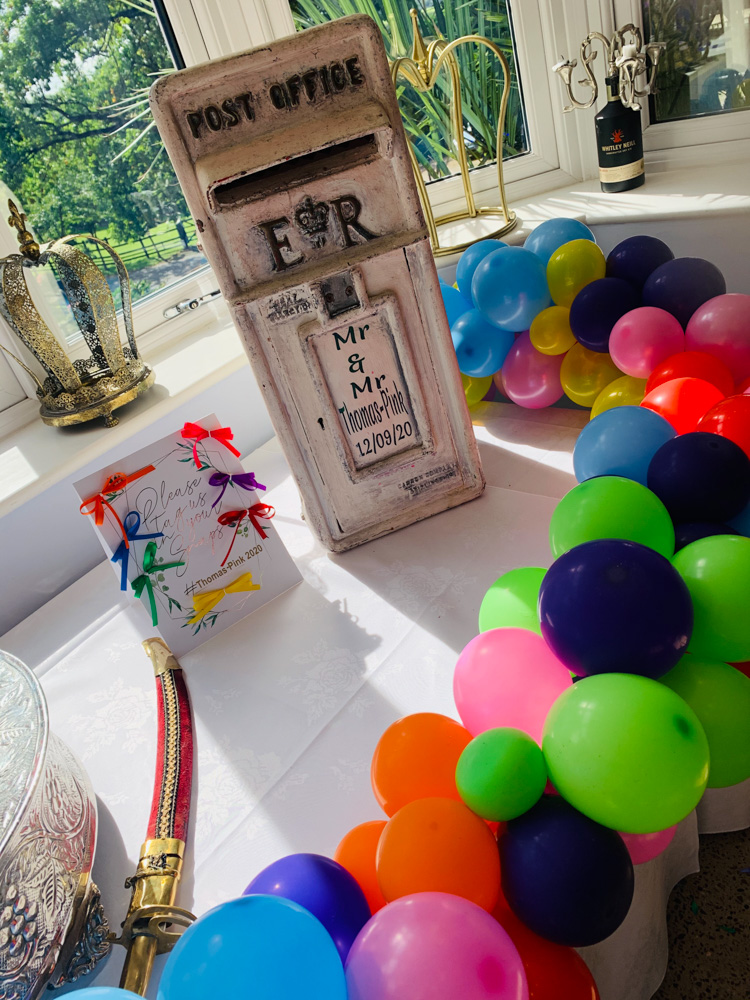 The guests slowly began arriving at the hotel, in which they were greeted with a glass of prosecco and a plate of hors d’oeuvres, slowly they began to take a seat outside on the terrace where it had been decorated to our couples specifications. The tables were covered in white linen with black table runners, to contrast with the bright multi-coloured flowers placed on mirrored chargers as the centrepieces, these were gifted to Neil and Paul by Penny Johnson florist on Coleshill high street. Each place setting then had a small plate with black covid friendly napkin pouches filled with individual cutlery and confetti cones in. Balloons featured heavily in the decor with a multicoloured balloon photo wall situated in the Waldron suite for guests to take photos with as they walked in, along with the cake table which held the beautifully decorated two tier cake on the round cake stand and not to forget our post-box which took its pride of place next to the cake, to finish it off the table was surrounded by a strip of balloons. We then had a gorgeous balloon archway on the terrace with balloon pillars to match and bring it all together.