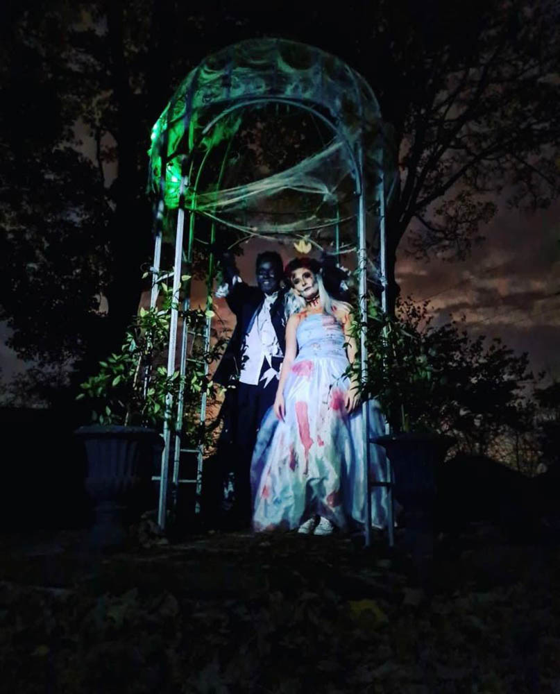 However we didn’t just stop at decorations as we also had our members of staff participating in our scare fest with Paul and Carol as Frankenstein’s monster and wife jumping out at guests. We also had Chloe dressed as a dead prom queen running around the woods in her white prom dress. Not to forget Luc and Matt who were dressed all in black with scary masks, taking every opportunity to jump out and scare those walking through. Finally at the end of our trail under the wonderfully decorated bandstand our guests were treated with a a little goody bag filled with sweets to take home.