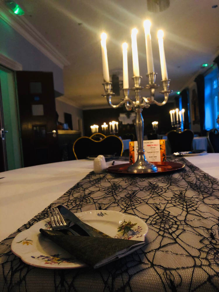Each table holding no more than 6 people had been decorated with a white tablecloth for the base and a spider-web table runner down the middle, finished off with a Silver candelabra on an orange charger for the centrepiece. We also had our larger candelabras placed around the room all lit to create the perfect spooky atmosphere and of course no Halloween is complete without pumpkins which we had lots of on show around the room, and grounds carved by our very own staff. Once each group had finished their meal they then enjoyed a walk around our woodlands, times had been allocated to keep everyone distanced and safe.