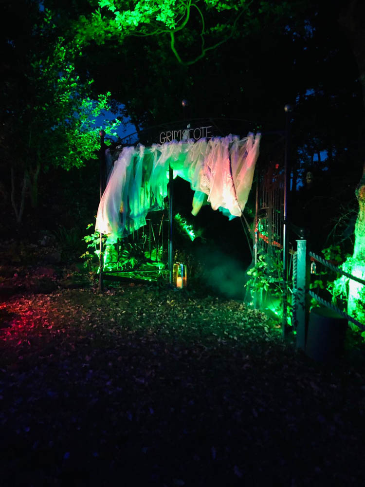 and the hallway leading up to our Waldron suite all dressed up in our Halloween decor. We also made sure that our beautiful woodland trail had its own Halloween makeover. Beginning at the Grimscote Manor arch way, our guests began their walk through the smoke, with candles leading their way along the trail and a few of our special effect lights dotted throughout the woods illuminating the trees, creating the perfect Halloween setting. Our guests also made sure to keep an eye out for any spooky creatures that lurked including ghosts, scarecrows even our chickens! As families wandered along the dark paths looking at all the decorations, scary sound effects could be heard.