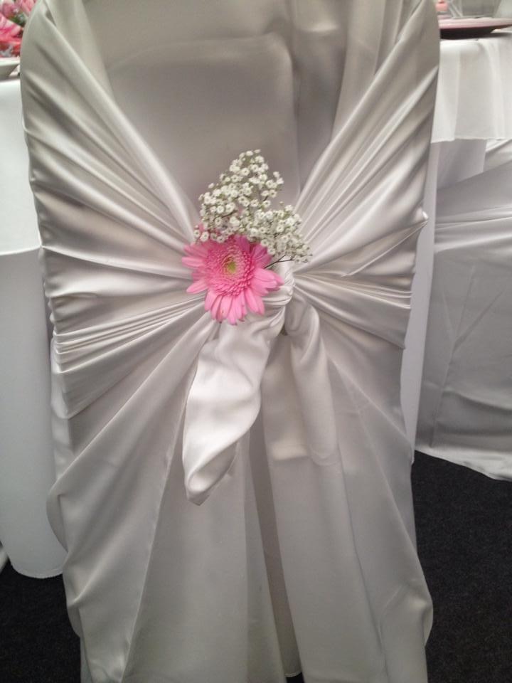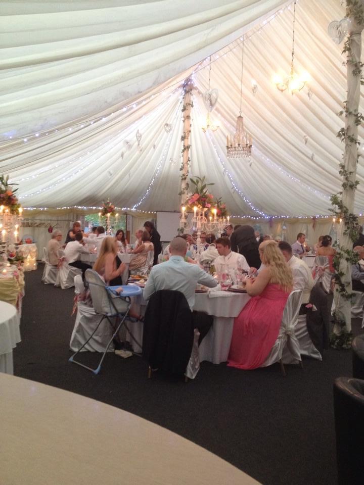 Their wedding was a wonderful celebration starting at the Coleshill church where they proclaimed their love for one another, then they came to us for their reception which took place in our fabulous marquee. With five round tables spread around the marquee and a oblong top table. Each table had a white base table cloth with a pink and silver diamante table runner across the middle and one of the gorgeous cream candelabras placed in the centre, the breathtaking pink and white floral engagement on top these made the perfect statement piece for every table. Each place setting consisted of a hot pink charger which had each person’s menu placed on them, their cutlery placed alongside along with one of our beautiful napkin swans made from the bride’s choice of white and pink patterned napkins. The bride and groom then completed each place setting with their wedding favours which were in lovely pink boxes. The chairs surrounding each table all had a beautiful white satin cover, every other chair had a pink ribbon bow and the alternate chairs had a beautiful flower decoration. The whole wedding was a beautiful celebration and certainly not one to forget.